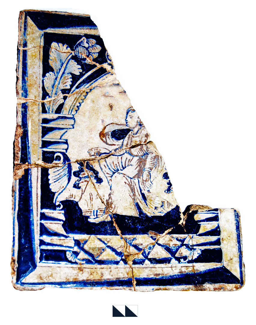 Excavations in the Kochubei’s court in 2018.Fragments of the ceramic plaques depicting human figures glazed Delft blue and white in the Dutch style from the embellishment of stoves of mid...
